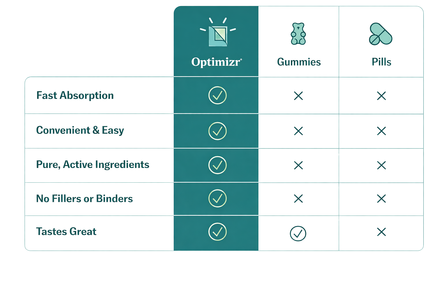 Unlike pills or gummies, Optimizr strips dissolve quickly and absorb through the mouth, allowing them to bypass the digestive system and absorb quicker into your body.
